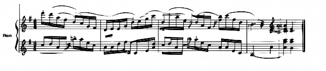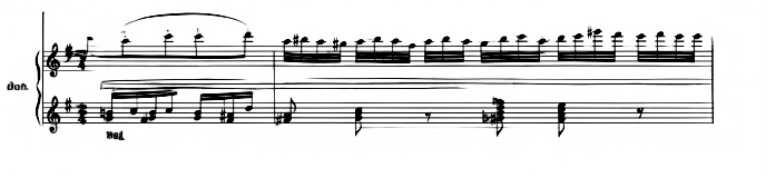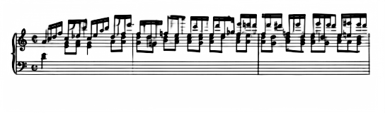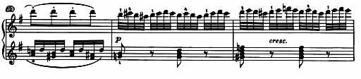 measure key:fifths:1 time beats:2 beat-type:4 clef:G2 staff:1 clef:G2 staff:2 D6 voice:1 eighth stem:down staff:1 beam:begin tied:stop slur:start staccato D6 eighth staccato D6 eighth staccato D6 eighth beam:end slur:stop staccato backup half A4 voice:2 16th stem:up staff:2 beam:begin beam:begin chord C5 16th natural D5 16th G4 16th sharp chord B4 16th D5 16th beam:end beam:end A4 16th beam:begin beam:begin chord C5 16th D5 16th F4 16th chord A4 16th sharp D5 16th beam:end beam:end measure B5 voice:1 32nd stem:down staff:1 beam:begin beam:begin beam:begin C6 32nd sharp B5 32nd A5 32nd sharp beam:end beam:end beam:end B5 32nd beam:begin beam:begin beam:begin C6 32nd D6 32nd C6 32nd beam:end beam:end beam:end B5 32nd beam:begin beam:begin beam:begin C6 32nd B5 32nd A5 32nd beam:end beam:end beam:end B5 32nd beam:begin beam:begin beam:begin C6 32nd D6 32nd C6 32nd beam:end beam:end beam:end backup half G4 voice:2 eighth natural stem:up staff:2 chord B4 eighth rest eighth G4 eighth stem:down chord B4 eighth chord D5 eighth rest eighth measure D6 voice:1 32nd stem:down staff:1 beam:begin beam:begin beam:begin E6 32nd D6 32nd C6 32nd sharp beam:end beam:end beam:end D6 32nd beam:begin beam:begin beam:begin E6 32nd F6 32nd natural E6 32nd beam:end beam:end beam:end D6 32nd beam:begin beam:begin beam:begin E6 32nd D6 32nd C6 32nd beam:end beam:end beam:end D6 32nd beam:begin beam:begin beam:begin E6 32nd F6 32nd E6 32nd beam:end beam:end beam:end backup half G4 voice:2 eighth sharp stem:down staff:2 chord B4 eighth chord D5 eighth chord F5 eighth natural rest eighth G4 eighth chord B4 eighth chord D5 eighth chord F5 eighth rest eighth