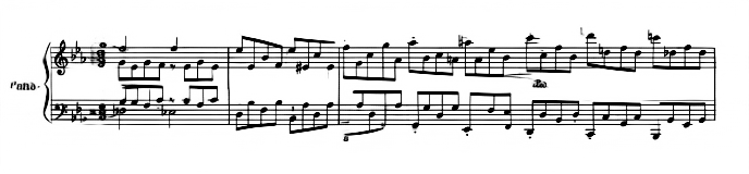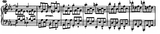 measure key:fifths:-3 time beats:2 beat-type:2 clef:G2 staff:1 clef:F4 staff:2 E5 voice:1 half stem:up staff:1 tied:stop E5 half backup whole G4 voice:2 eighth stem:down staff:1 beam:begin E4 eighth G4 eighth E4 eighth beam:end rest eighth E4 eighth beam:begin G4 eighth E4 eighth beam:end backup whole G3 voice:3 eighth stem:up staff:2 beam:begin B3 eighth G3 eighth B3 eighth beam:end rest eighth B3 eighth beam:begin G3 eighth B3 eighth beam:end backup whole D3 voice:4 half flat stem:down staff:2 tied:stop D3 half flat measure E5 voice:1 eighth stem:up staff:1 beam:begin staccato E4 eighth A4 eighth E4 eighth beam:end E5 eighth natural beam:begin staccato E4 eighth natural C5 eighth E4 eighth beam:end backup whole C3 voice:2 eighth stem:down staff:2 beam:begin staccato A3 eighth E3 eighth A3 eighth beam:end B2 eighth beam:begin staccato G3 eighth C3 eighth G3 eighth beam:end measure F5 voice:1 eighth stem:down staff:1 beam:begin staccato F4 eighth C5 eighth F4 eighth beam:end G5 eighth beam:begin staccato G4 eighth C5 eighth G4 eighth beam:end backup whole A2 voice:2 eighth stem:down staff:2 beam:begin staccato A3 eighth C3 eighth A3 eighth beam:end G2 eighth stem:up beam:begin staccato G3 eighth C3 eighth G3 eighth beam:end measure A5 voice:1 eighth stem:down staff:1 beam:begin staccato A4 eighth C5 eighth A4 eighth beam:end A5 eighth natural beam:begin staccato A4 eighth natural C5 eighth A4 eighth beam:end backup whole F2 voice:2 eighth stem:up staff:2 beam:begin staccato F3 eighth C3 eighth F3 eighth beam:end E2 eighth beam:begin staccato E3 eighth F2 eighth E3 eighth beam:end measure B5 voice:1 eighth stem:down staff:1 beam:begin staccato B4 eighth F5 eighth B4 eighth beam:end C6 eighth beam:begin staccato C5 eighth F5 eighth C5 eighth beam:end backup whole D2 voice:2 eighth stem:up staff:2 beam:begin staccato D3 eighth F2 eighth D3 eighth beam:end C2 eighth beam:begin staccato C3 eighth F2 eighth C3 eighth beam:end measure D6 voice:1 eighth flat stem:down staff:1 beam:begin D5 eighth flat F5 eighth D5 eighth beam:end D6 eighth natural beam:begin D5 eighth natural F5 eighth D5 eighth beam:end backup whole B1 voice:2 eighth stem:up staff:2 beam:begin staccato B2 eighth F2 eighth B2 eighth beam:end A1 eighth beam:begin staccato A2 eighth F2 eighth A2 eighth beam:end
