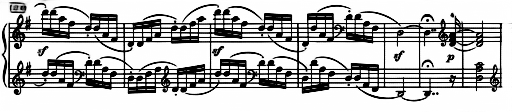 measure key:fifths:1 time beats:2 beat-type:4 clef:G2 staff:1 clef:G2 staff:2 D6 voice:1 16th stem:down staff:1 beam:begin beam:begin slur:stop staccato D6 16th slur:start A5 16th F5 16th beam:end beam:end D5 16th stem:up beam:begin beam:begin slur:stop staccato D5 16th slur:start A4 16th F4 16th beam:end beam:end backup half D5 voice:2 16th stem:up staff:2 beam:begin beam:begin staccato D5 16th A4 16th F4 16th beam:end beam:end clef:F4 staff:2 D4 16th stem:down beam:begin beam:begin staccato D4 16th A3 16th F3 16th beam:end beam:end measure D4 voice:1 16th stem:up staff:1 beam:begin beam:begin slur:stop staccato D4 16th slur:start F4 16th A4 16th beam:end beam:end D5 16th stem:down beam:begin beam:begin slur:stop staccato D5 16th slur:start F5 16th A5 16th beam:end beam:end backup half D3 voice:2 16th stem:down staff:2 beam:begin beam:begin staccato D3 16th F3 16th A3 16th beam:end beam:end clef:G2 staff:2 D4 16th stem:up beam:begin beam:begin staccato D4 16th F4 16th A4 16th beam:end beam:end measure D6 voice:1 16th stem:down staff:1 beam:begin beam:begin slur:stop staccato D6 16th slur:start A5 16th F5 16th beam:end beam:end D5 16th stem:up beam:begin beam:begin slur:stop staccato D5 16th slur:start A4 16th F4 16th beam:end beam:end backup half D5 voice:2 16th stem:up staff:2 beam:begin beam:begin staccato D5 16th A4 16th F4 16th beam:end beam:end clef:F4 staff:2 D4 16th stem:down beam:begin beam:begin staccato D4 16th A3 16th F3 16th beam:end beam:end measure D4 voice:1 16th stem:up staff:1 beam:begin beam:begin slur:stop staccato D5 16th slur:start A4 16th F4 16th beam:end beam:end clef:F4 staff:1 D4 16th stem:down beam:begin beam:begin slur:stop staccato D4 16th slur:start A3 16th F3 16th beam:end beam:end backup half D3 voice:2 16th stem:down staff:2 beam:begin beam:begin staccato D4 16th A3 16th F3 16th beam:end beam:end D3 16th stem:up beam:begin beam:begin staccato D3 16th A2 16th F2 16th beam:end beam:end measure D3 voice:1 half stem:down staff:1 tied:start slur:stop backup half D2 voice:2 half stem:up staff:2 tied:start measure D3 voice:1 quarter dot dot stem:down staff:1 tied:stop fermata clef:G2 staff:1 D4 16th stem:up tied:start chord F4 16th tied:start chord A4 16th tied:start backup half D2 voice:2 quarter dot dot stem:up staff:2 tied:stop fermata rest 16th measure D4 voice:1 half stem:up staff:1 tied:stop chord F4 half tied:stop chord A4 half tied:stop backup half D3 voice:2 half stem:down staff:2 chord A3 half chord C4 half